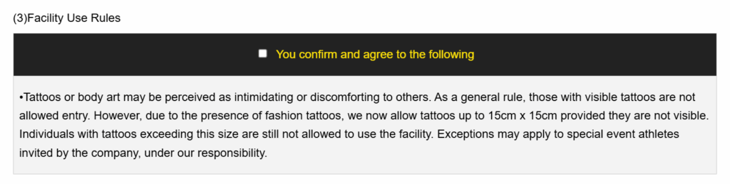 If you have tattoos, check the gym’s policy before deciding where to go. In Japan, tattoos have long been associated with the yakuza (organized crime groups), so they still carry a lingering stigma and some places either forbid them or require they be covered up.