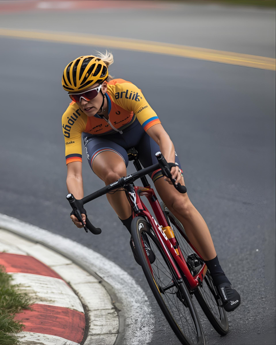 7. Get comfy cornering. Counterintuitively, cornering effectively means keeping the smoothest, straightest path possible through the turn. This means approaching the corner wide, leaning in toward the apex or the inside corner and then exiting wide. For first timers, keep your center of gravity low and look through the corner to where you want to go. Position your inside foot up at 12 o’clock and your outside foot down at 6 o’clock as you navigate the turn—this keeps your inside pedal from striking the ground and makes you look like a total badass (just like AI Betty in the picture below). Take corners slowly at first, gradually picking up speed as you gain experience and confidence.